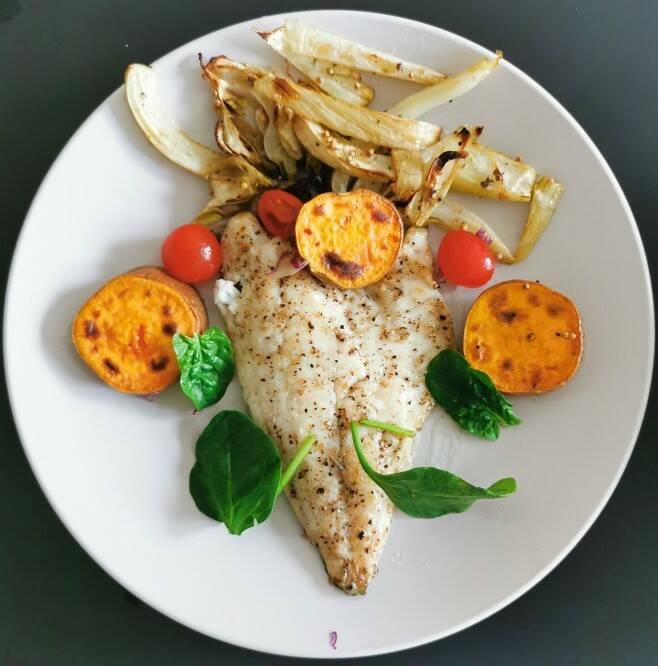 Goudbrasem op het vel gebakken met gegrilde venkel en geconfijte zoete aardappel