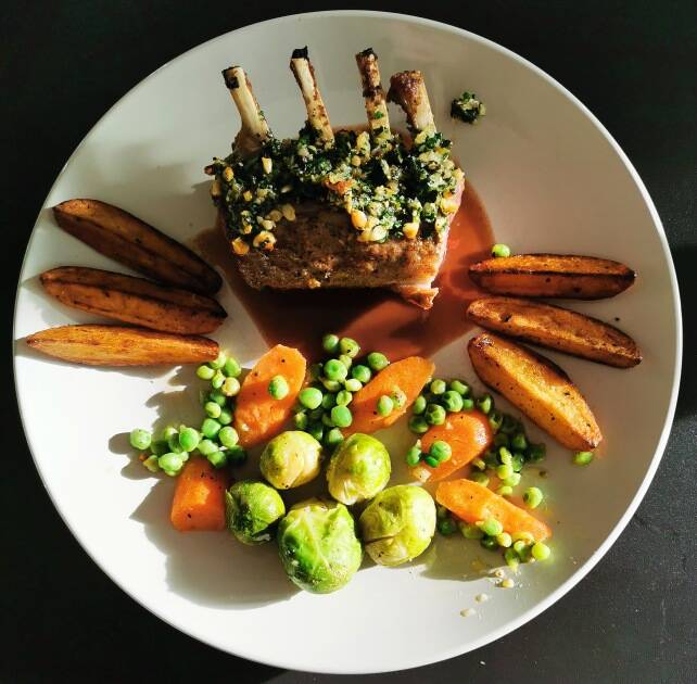 Lamskroon met kruidenkorst, portosaus, groentegarnituur en geconfijte country potatoes