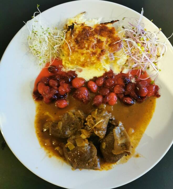 Stoverij van hinde met portosaus, verse veenbessen en gratin van savooikool