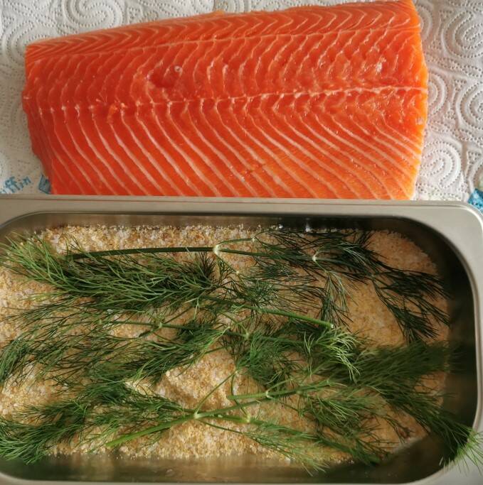 Pekelen van de zalm: Maak een mengeling van gelijke delen bruine suiker en grof zeezout. Meng er ruim grof gemalen zwarte peper onder. Vul een schaal, waarin de zalm ongeveer past, eerst met een laag (+/- 1cm van het zout+ suiker+ pepermengsel, leg er een laagje dille en wat mosterdzaadjes op en vervolgens het zalmhaasje. Leg nu op de zalm opnieuw een laagje in omgekeerde volgorde. (foto 2). Plaats een schaal met een zwaar gewicht bovenop en zet in de koelkast voor 24h. Vervang na ongeveer 12h het zout/suikermengsel als dit te nat is geworden. Het is de bedoeling om zoveel mogelijk vocht aan de zalm te onttrekken. (foto 3)